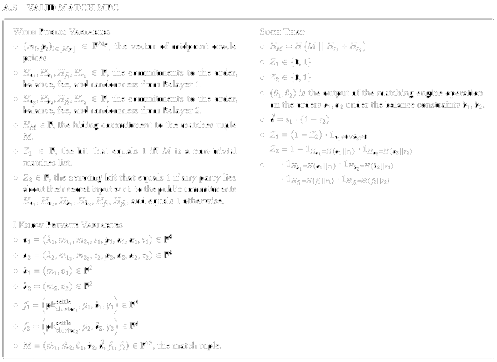 To solve this atomic settlement problem, we use the collaborative SNARK framework from Ozdemir and Boneh. By wrapping zero-knowledge proof generation inside of a MPC algorithm, collaborative SNARKs allow for the relayers to collaboratively prove a particular NP statement, VALID MATCH MPC. This statement essentially claims that given the publicly-known commitments to order information and a public commitment to a matches tuple, both traders do indeed know valid input orders.